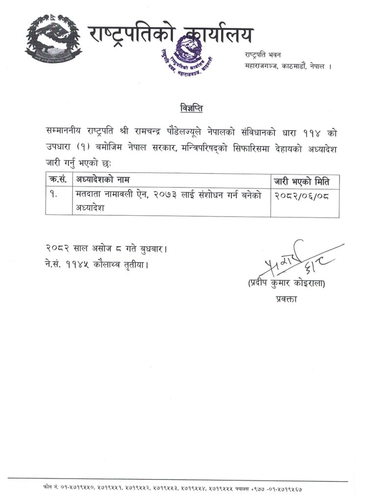 आगामी २१ फागुनका लागि तोकिएको निर्वाचनलाई लक्षित गरी मतदाता नामावली ऐन, २०७३ लाई संशोधन गर्न अध्यादेश जारी भएको छ । राष्ट्रपति रामचन्द्र पौडेलले बुधबार मतदाता नामावली संशोधनसम्बन्धी अध्यादेश जारी गरेका हुन् ।