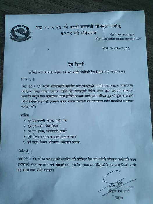 जेन–जी आन्दोलन दमनबारे जाँचबुझ गर्न गठित न्यायिक आयोगले निर्वतमान प्रधानमन्त्री केपी शर्मा ओली तथा निवर्तमान गृहमन्त्री रमेश लेखकसहित ५ जनालाई विदेश जान रोक लगाउने निर्णय गरेको छ । २३ र २४ भदौमा भएको घटनाको सम्बन्धमा छानविन गर्न गठिन जाँचबुझ आयोगले यस्तो निर्णय गरेको हो। बयानमा जुनसुकै बेला बोलाउन सक्ने भएकाले पूर्वस्वीकृतीबिना उपत्यका छाड्न समेत नदिने निर्णय आयोगले गरेको छ । पासपोर्ट रोक्काको सूचीमा पर्नेहरुमा तत्कालिन गृहसचिव गोकर्णमणि दुवाडी, तत्कालिन गुप्तचर प्रमुख हुतराज थापा, काठमाडौंका तत्कालिन सिडिओ छवि रिजाल पनि रहेका छन् । २३ गतेको दमनमा संलग्नताको आधारमा उनीहरु छानविनमा तानिएका हुन् ।