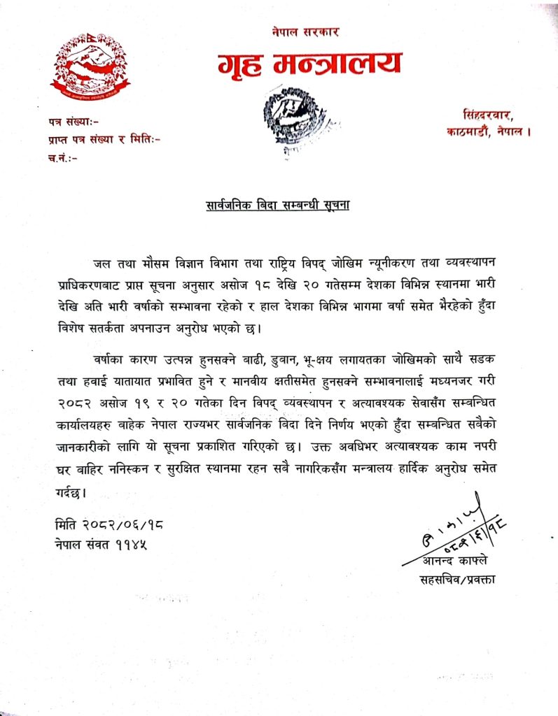 काठमाण्डौं १८ असोज ।सरकारले आइतबार र सोमबार सार्वजनिक बिदा दिएको छ । अविरल वर्षासँगैको प्रतिकुल परिस्थितिलाई मध्यनजर गर्दै सरकारले दुई दिन बिदा दिएको जनाएको छ । यसअघि दशैंको बिदा सकिएर असोज १९ अर्थात भोलिबाट सरकारी कार्यालय खुल्ने भनिएको थियो ।