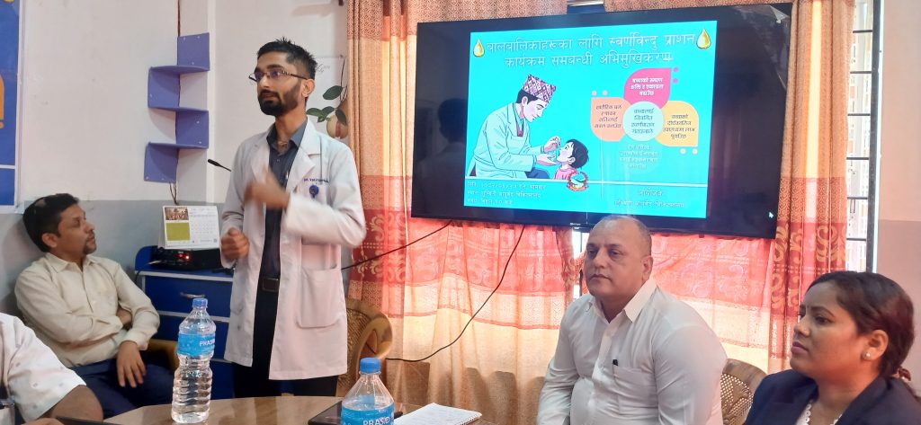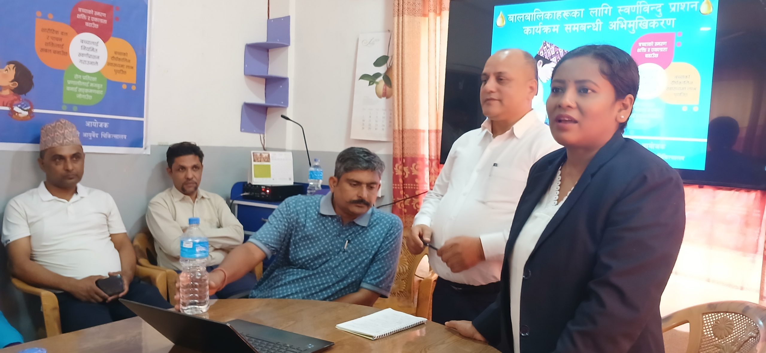 स्वर्णबिन्दु प्राशन कार्यक्रमसम्बन्धी सोमबार सम्पन्न अभिमुखिकरणमा कार्यालय प्रमुख विश्वकर्माले केन्द्र र प्रदेश सरकारले बालबालिकाका लागि सुरु गरेको नयाँ अभियान भएकाले आवश्यक छलफल र आबश्यक तयारी गरेर ‘स्वर्णविन्दु प्राशन’ खुवाउने कार्यक्रम सुरु गर्न लागिएको बताइन् । ‘यही २९ असोजदेखि हुन लागेको ‘स्वर्ण प्राशन’ अभियानका लागि आवश्यक तयारी अन्तिम चरण पुगेको छ,’ उनले भनिन् । यो अभियान अन्तर्गत ६ महिनादेखि ५ वर्ष उमेर समूहका बालबालिकालाई यो थोपा खुवाउन लागिएको हो । स्वर्ण प्राशन थोपा बिहान ६ बजेदेखि १० बजेसम्म खुवाइने कार्यालय प्रमुख विश्वकर्माले बताइन् । तोकिएको उमेर समूहका बालबालिकालाई यो थोपा खुवाउन समयमै ल्याउन उनले सबैलाई आह्वानन गरिन् ।