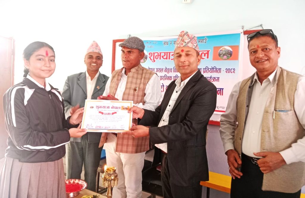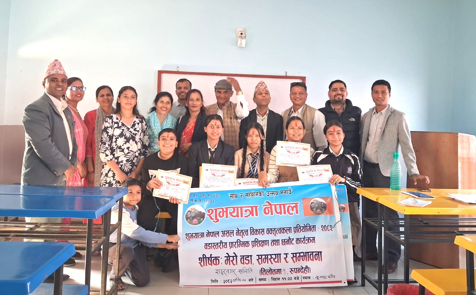 शुभयात्रा नेपाल रूपन्देहीले आयोजना गरेको तिलोत्तमा नगरस्तरीय असल नेतृत्व वक्तृत्वकला प्रतियोगिताको छनौट चरण शनिबार देखि शुरू भएको छ । नगरभित्र बसोबास गर्ने सत्र वटै वडाका मा.वि. तहका विद्यार्थीबीच “असल नेतृत्वमा आधारित” प्रतिस्पर्धा गराउन आज (शनिबार) देखि प्रारम्भिक प्रशिक्षण सहितको छनौट कार्यक्रम शुरू गरिएको संस्थाका जिल्ला अध्यक्ष मुक्तिनाथ गैह्रेले जानकारी दिए ।