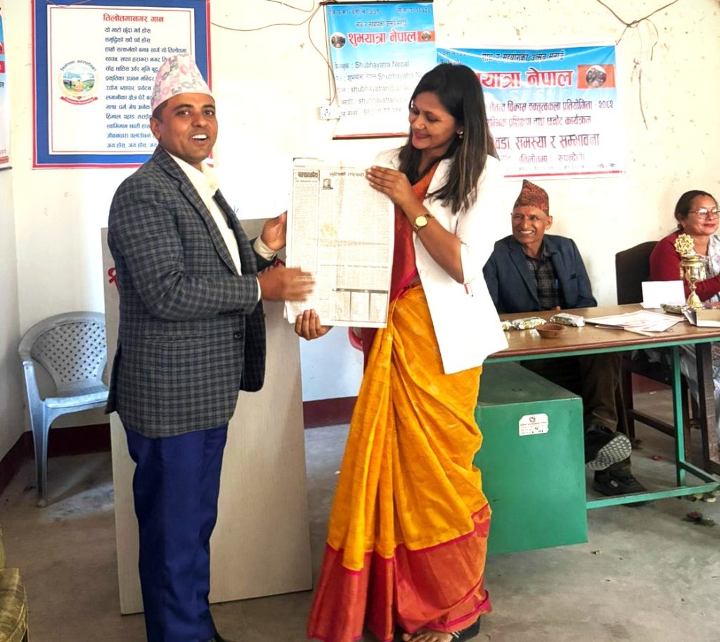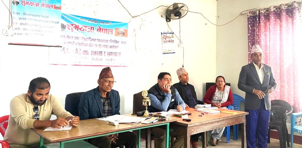 कार्यक्रम तिलोत्तमा ३ को वडा कार्यालय परिसरस्थित दुर्गामन्दिर हलमा आयोजित कार्यक्रम शुभयात्रा नेपालका सदस्य डुमा कुमारी न्यौपानेको सञ्चालन तथा पार्वती काफ्लेको स्वागतमा भएको थियो ।