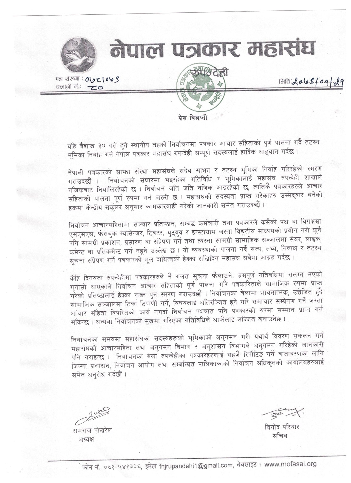 नेपाल पत्रकार महासंघ रुपन्देही शाखाले बैशाख ३० गते हुने स्थानीय तहको निर्वाचनमा पत्रकार आचार संहिताको पूर्ण पालना गर्दै तटस्थ भूमिका निर्वाह गर्न आफ्ना सम्पूर्ण सदस्यलाई आहृवान  गरेको छ । पत्रकार महासंघ रुपन्देहीका अध्यक्ष रामराज पोखरेल र सचिब बिनोद परियार हस्तक्षरित विज्ञप्ति मार्फत पत्रकारहरुले निर्बाचन आचार संहिता पुर्ण पालन गर्न आग्रह गरिएको हो । बिज्ञप्तीमा निर्वाचनका बेलामा भावनात्मक, उत्तेजित हुँदै सामाजिक सञ्जालमा टिका टिप्पणी गर्ने, बिषयलाई अतिरञ्जित हुने गरि समाचार सम्प्रेषण गर्ने जस्ता आचार संहिता विपरितको कार्य नगर्दा निर्वाचन पश्चात पनि पत्रकारको रुपमा सम्मान प्राप्त गर्न सकिने स्पष्ट पारेको छ ।