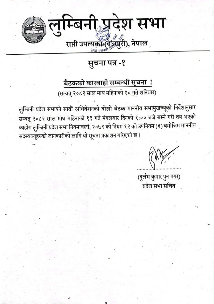 लुम्बिनी प्रदेश सभा सचिव दुर्लभ पुन मगरले शनिबार एक सूचना जारी गर्दै प्रदेश सभाको बैठक सभामुुख तुलाराम घर्तिमगरको निर्देशन बमोजिम माघ १३ गते मंगलबार दिउसो १ बजे बस्ने उल्लेख गरेका छन् । लुम्बिनी प्रदेश सभाको नियमावली २०७९ को नियम १२ को उपनियम ३ बमोजिम उक्त दिन बैठक बस्ने सूचनामा उल्लेख गरिएको छ । सातौँ अधिवेशन शुरु भएको दिन मंसिर ८ गते एउटा मात्रै बैठक बसेको थियो ।