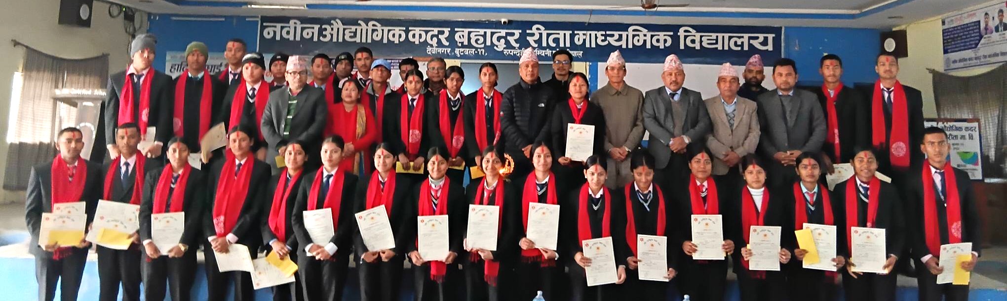 राष्ट्रिय सेवादलद्वारा संचालित तालिममा सर्वोकृष्ट विद्यार्थीलाई सम्मान गरिएको छ । राष्ट्रिय सेवादलद्वारा सिनियर डिभिजन तर्फ संचालित २० औं क्याडेट चौथो सामुहिक क्याम्पको उनासी दिन विद्यालयमा एक्काइस दिन राष्ट्रिय सेवादल हात्तीखोर नवलपरासीमा गरी एक सय दिनको तालिममा सर्वोकृष्ट विद्यार्थीलाई नवीन औद्योगिक कदर बहादुर रीता माध्यमिक विद्यालयमा सम्मान गरिएको हो । विद्यालयका प्रधानाध्यापक प्रेम बहादुर बस्नेतका अनुसार एक सय दिनको ड्रिल, कवाज, लिखित परीक्षा, प्रस्तुतीकरण, मार्शल आर्ट, दौड, भलिवल, बुटवल र नृत्य लगायतका विधाबाट उत्कृष्ट भइ १८ वटा विद्यालयका ५३० जना मध्ये उत्कृष्ट विद्यार्थीलाई सम्मान गरिएको हो । ५३० जना विद्यार्थी मध्ये छात्रा तर्फ सर्वोकृष्ट भइ माघ २० गते राष्ट्रिय सेवादल हात्तीखोरमा आयोजित दिक्षान्त कवाजमा सर्वोकृष्ट भइ प्रधानमन्त्री शुशिला कार्कीद्वारा सम्मानित अविक्षा श्रेष्ठलाई विद्यालयको तर्फबाट सम्मान गरिएको बस्नेतले बताए । कार्यक्रममा अविक्षाका बुवा, आमा र राष्ट्रिय सेवादलमा सम्पन्न भलिवलमा विजेता विद्यार्थी, रुपन्देही जिल्लाको स्याण्ड मोडल ब्रिफिङमा तृतीय हुन सफल नितु कुमारी गौड, अमृत राकस र अन्य राष्ट्रिय सेवादलमा सहभागी विद्यार्थीलाई सम्मान गरिएको छ । कार्यक्रममा विद्यालयका प्रधानाध्यापक प्रेम बहादुर बस्नेतले विद्यालयका सवल पक्षहरु र विशेषताहरु जानकारी गराएका थिए ।
