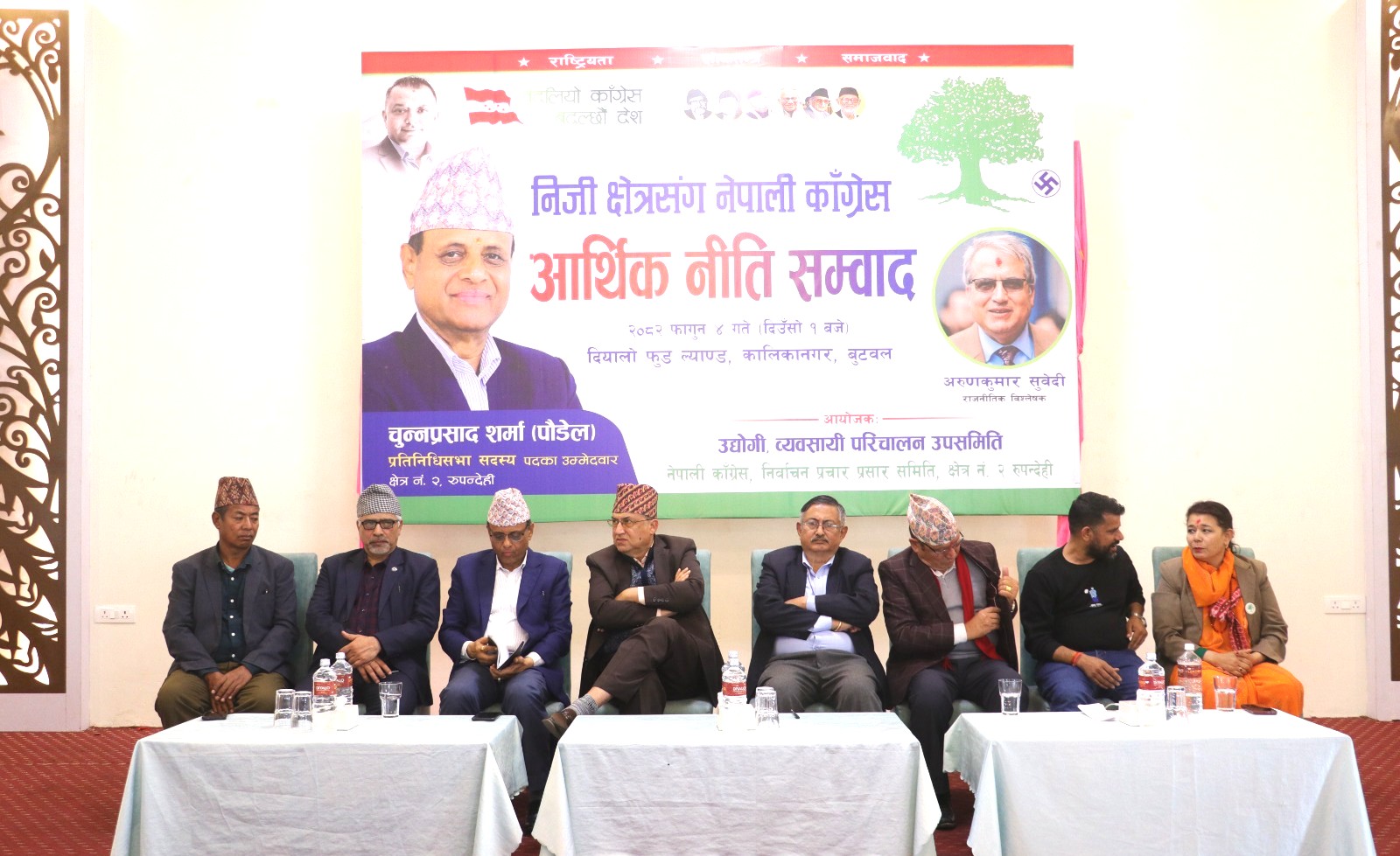 कार्यक्रममा बोल्दै पूर्व मन्त्री बालकृष्ण खाँणले कांग्रेसले रुपन्देहीमा लुम्बिनी प्रदेशको अस्थायी मुकाम तोकेको स्मरण गर्दै बुटवलबाट राजधानी दाङ सार्नेलाइ अब यहाँका जनताले अनुमोदन गर्न नहुने बताए । देश र लोकतन्त्रलाई बलियो बनाइ संविधान कार्यान्वयन गर्न नेपाली कांग्रेसलाइ जिताउनुपर्ने नेता खाँणको भनाइ छ । सो अवसरमा बोल्दै राजनीतिक बिश्लेषक अरुणकुमार सुवेदीले नेपालमा गिरिजाप्रसाद कोइराला नेतृत्वको पालामा बिस २०४८ सालको बैंकिङ उदारिकरणको नीतिले देशमा आर्थिक अवस्था सुधारिएको र साना ब्यवसायीले पनि ठूलो कारोबार गरेर आर्थिक अबस्था अब्बल बनेको उल्लेख गरे । उनले २०६३ सालपछि देश कम्यूनिष्टको नेतृत्वमा जाँदा तहसनहस भएको भन्दै अब कांग्रेसले यसलाइ सुधारेर जनतामा आशा जगाउनुपर्ने बताए ।