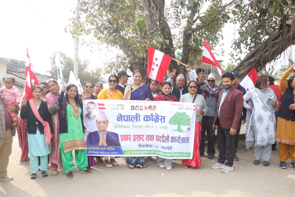 कांग्रेस उम्मेदवारहरूले रुपन्देही क्षेत्र नम्बर २ मा घरदैलो अभियानलाई तीव्र बनाएका छन् । उम्मेदवार पौडेलले घरदैलोका क्रममा आफू निर्वाचित भएपछि स्थानीयस्तरका समस्यालाई प्राथमिकताका साथ समाधान गर्ने प्रतिबद्धता व्यक्त गरे । उनले कांग्रेस नेतृत्वमै स्थायित्व र विकास सम्भव रहेको भन्दै प्रत्येक टोल–टोलका समस्या पहिचान गरी योजनाबद्ध ढंगले काम गर्ने बताए । पौडेलले ५ वर्षभित्र नेपाललाई भ्रष्टाचारमुक्त बनाउने संकल्प समेत जनताका बिचमा गरेका छन् । उनले यो प्रतिज्ञा पूरा गर्न कांग्रेसले के–के गर्ने भन्ने बिषय घोषणापत्रमा उल्लेख गरिएको पनि बताए । उनले जनताको समस्या नै हाम्रो पहिलो प्राथमिकता रहेको बताउदै सैनामैनामा देखिएका सुकुम्बासी, सडक, शिक्षा र तटबन्ध जस्ता विषयलाई योजनाबद्ध रूपमा अघि बढाउने बताए ।