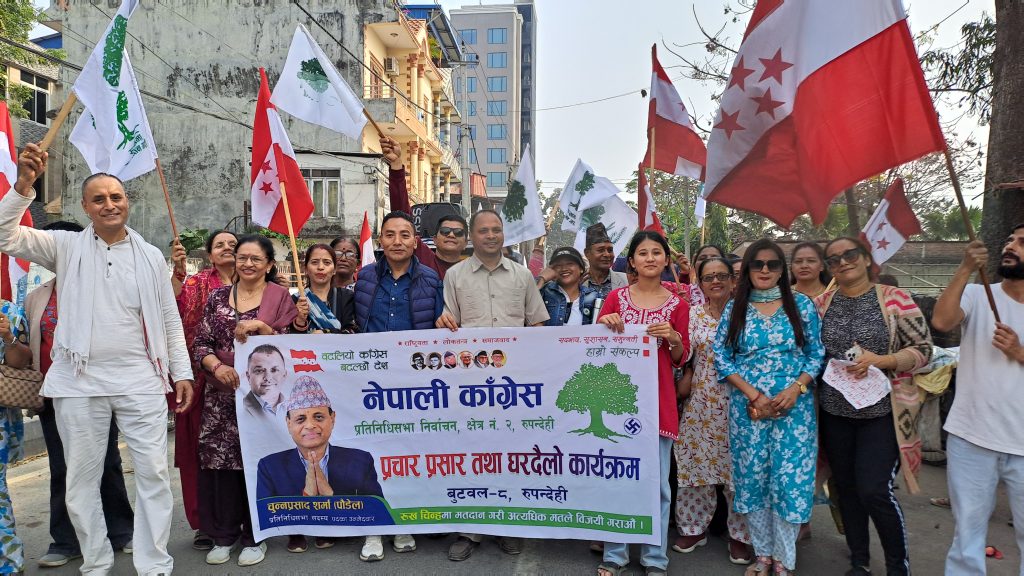 त्यसैगरी दिउँसो १ बजेबाट बुटवल उपमहानगरपालिका–८ मा पनि घरदैलो अभियान सञ्चालन गरिएको थियो । उक्त क्षेत्रमा शुक्रपथ, कुशुमपथ, धर्मपथ, राजमार्ग चौराहा, त्रिभुवनपथ, दशरथपथ, श्रवणपथ र भाटभटेनी लाइन आसपासमा पुगेर उम्मेदवारहरूले मतदातासँग भेटघाट गरेका थिए । स्थानीय बासिन्दाले खानेपानी, ढल निकास, सडक व्यवस्थापन तथा ट्राफिक समस्याका विषयमा आफ्ना धारणा राखेका थिए । केही स्थानमा ढल निकासको अभावले वर्षायाममा समस्या हुने गरेको गुनासोसमेत आएको थियो ।घरदैलो अभियानका क्रममा स्थानीयले उम्मेदवारलाई फूलमाला, टीका तथा खादा लगाएर स्वागत गरेका थिए । चुनावी अभियानमा पार्टीका स्थानीय नेता, कार्यकर्ता तथा शुभेच्छुकहरूको समेत उल्लेख्य उपस्थिति रहेको थियो । निर्वाचन नजिकिँदै जाँदा उम्मेदवारहरूले मतदातासँग प्रत्यक्ष भेटघाटलाई प्राथमिकता दिँदै घरदैलो अभियानलाई अझ तीव्र बनाएका छन् । कांग्रेसका उम्मेदवार पौडेलले विकास, सुशासन र स्थानीय समस्या समाधानलाई आफ्नो मुख्य एजेण्डा बनाएको बताएका छन् । अब बाँकी दिनहरूमा पनि विभिन्न वडामा घरदैलो तथा भेटघाट कार्यक्रमलाई निरन्तरता दिने प्रचारप्रसार संयोजक तथा क्षेत्रीय सभापति प्रजापाल गिरीले बताए ।
