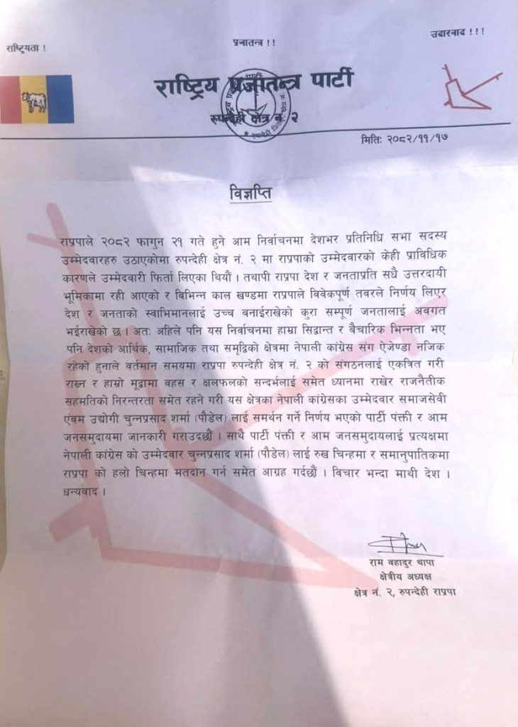 राप्रपाले सिद्धान्त र वैचारिक भिन्नता भए पनि वर्तमान राजनीतिक परिस्थितिमा आर्थिक, सामाजिक तथा समृद्धिको एजेन्डामा नेपाली काँग्रेससँग नजिक रहेकाले रुपन्देहीको क्षेत्र नं. २ मा काँग्रेस उम्मेदवारलाई चुन्नप्रसाद शर्मा पौडेललाई समर्थन गर्ने निर्णय गरिएको भन्दै
