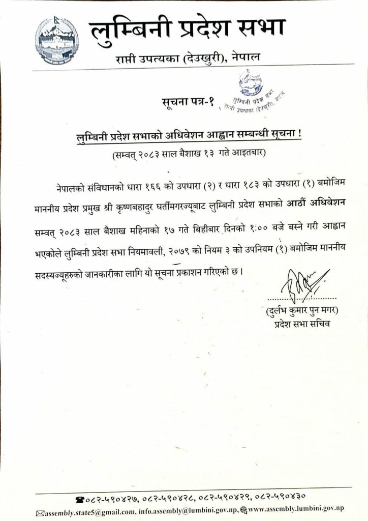 लुम्बिनी प्रदेश सभाको आठौं अधिवेशन आगामी वैशाख १७ गतेदेखि सुरु हुने भएको छ ।