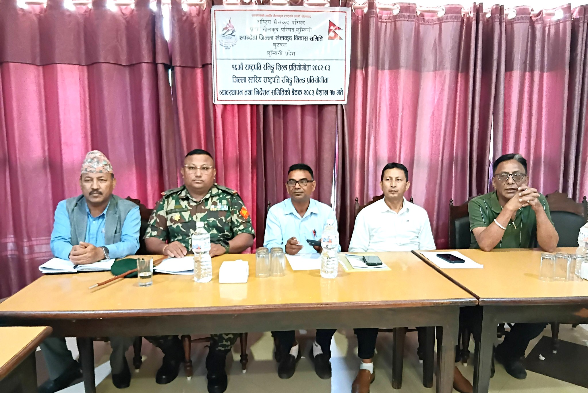 रुपन्देही जिल्ला स्तरीय १६ औँ राष्ट्रपति रनिङसिल्ड प्रतियोगिताको तयारी तीव्र पारिएको छ । प्रतियोगिता तयारीका क्रममा बिहिवार व्यवस्थापन तथा निर्देशन समितिको बैठक बुटवलमा सम्पन्न भएको छ।