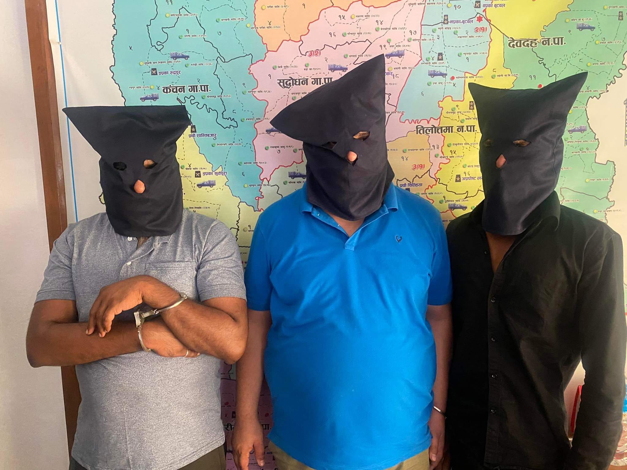 ईलाका प्रहरी कार्यालय बुटवल र ईलाका प्रहरी कार्यालय लुम्बिनीबाट खटि गएको प्रहरी टोलिले खोजतलासको क्रममा सोमवार साझ साढे ५ बजे लुम्बिनी साँस्कृतिक नगरपालिका वडा नं.–४ महुवारी स्थित खुनगाई कालीदह सडक खण्डबाट तीन जना पक्राउ परेका हुन । सवारी साधनहरु चेकजाँच गर्ने क्रममा भारतीय नम्बर प्लेटको युपी ३२ एल डब्लु ३१५१ नमवरको सवारीमा सवार रहेका मोहसिन अब्दुल्ला खान, मोहद जीशान खान, मो सारीकलाई प्रहरीले पक्राउ गरेको हो । उनीहरुलाई खानतलासी गर्दा निजहरुको साथवाट १०÷१० ग्रामको सुनको बिस्कुत थान–२, २० ग्रामको सुनको बिस्कुत थान–१, सुनको गरगहना गाली डल्लो बनाएको सुनको ढिक्का थान–१, सुनको पैसाको सिक्का आकारको गोलो थान–१, मोबाईल थान–३, नगद भा.रु. १ सय को नोट ६० वटा, आधार कार्ड, एटीएमा कार्ड फेला पारी पक्राउ गरी प्रहरी हिरासतमा राखिएको प्रहरीले जनाएको छ । तीन करोड मुल्यको सुन चोरी भएको बताइए पनि प्रहरीले बरामद गरेको सुन भने निकै कम रहेको छ । निजहरु उपर चोरी मुद्दामा थप अनुसन्धान भई रहेको प्रहरीको भनाइ छ ।