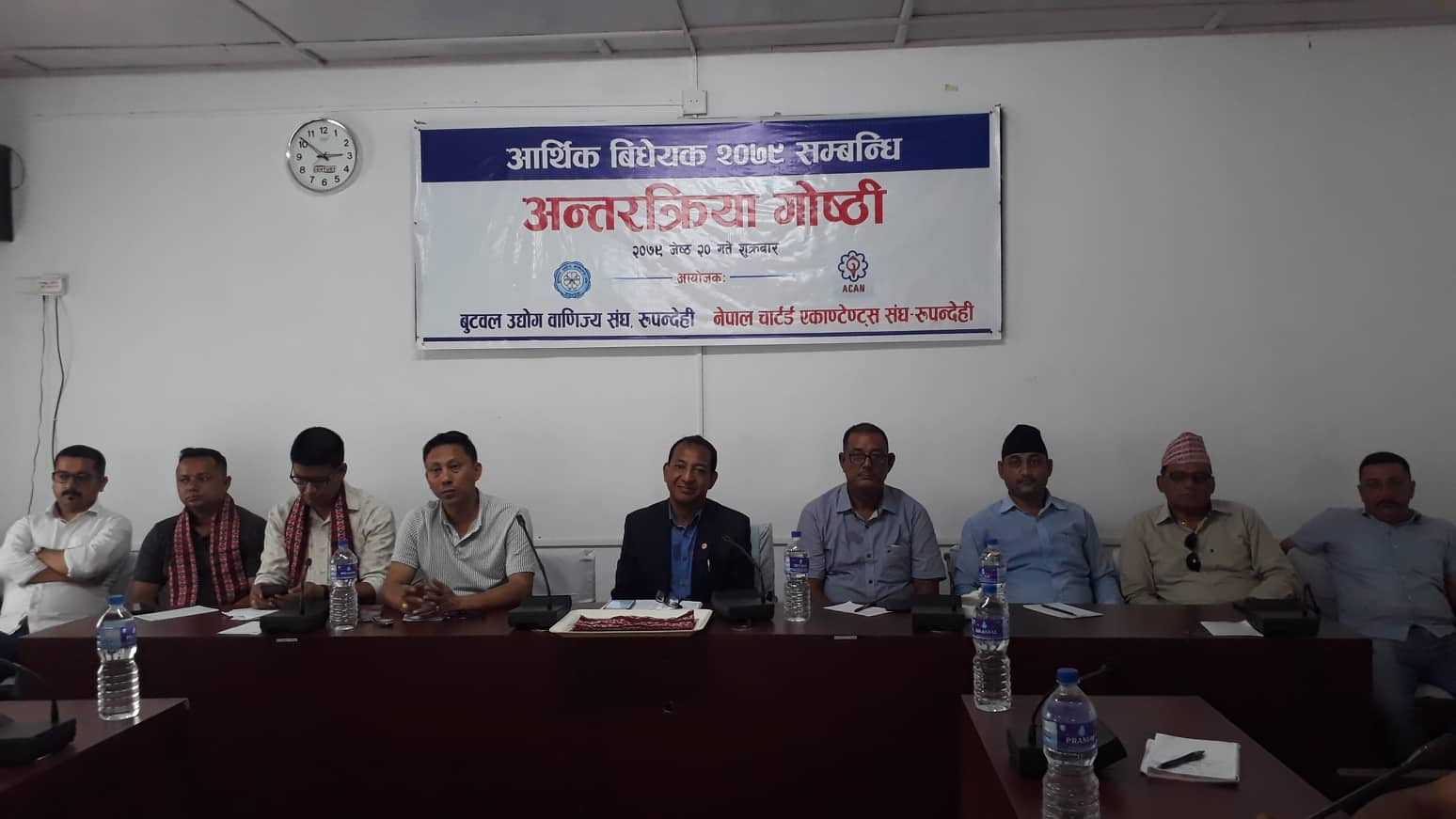 बुटवल उद्योग वाणिज्य संघ रुपन्देही र नेपाल चार्टर्ड एकाउण्टेण्ट संघ रुपन्देहीको संयुक्त आयोजना शुक्रबार बुटवलमा आर्थिक विद्येयक, २०७९ सम्बन्धि अन्तरक्रिया छलफल गरिएको थियो । उक्त छलफलमा चार्टर्ड एकाउण्टेण्टहरुले सो सुझाव राख्दै पहल गर्न आग्रह गरेका हुन ।