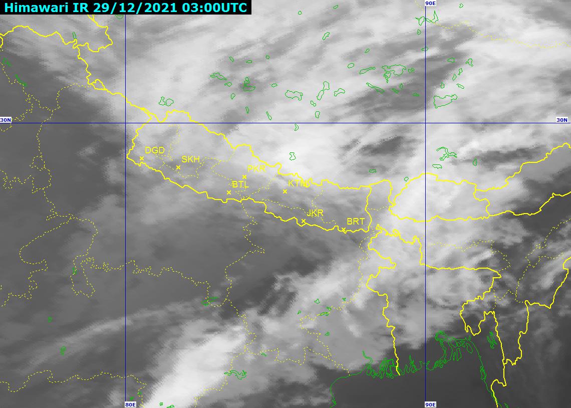 दिउँसो देशभर आंशिक देखि सामान्य बदली रही थोरै स्थानहरूमा हल्का वर्षा र उच्च पहाडी तथा हिमाली भूभागहरुका केही स्थानहरुमा हल्का देखि मध्यम हिमपातको संभावना रहेको छ ।